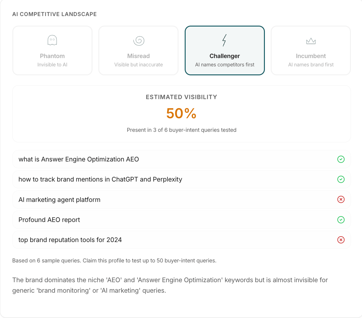 Your profile exists whether you've claimed it or not. It shows your BAI score, your archetype, what AI thinks your category is, who AI thinks you compete with, and what buyers are asking about you. If any of that is wrong — and for 60% of brands, something is — that's what AI is telling your buyers right now.